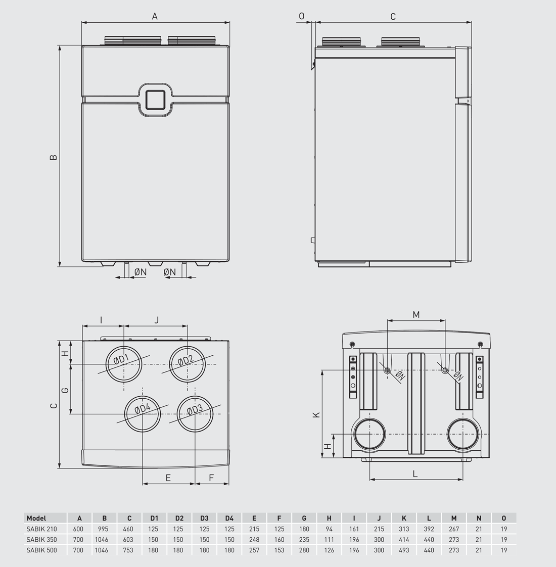 | SABIK 500 | 230 | 550 | 43,1 (400 m3/h a 150 Pa) | 165 | 85 |